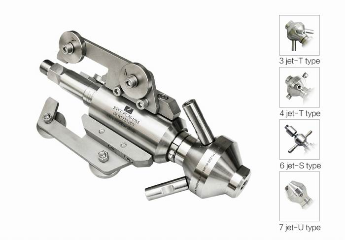 旋轉頭配有4T型加長杆,其中290°垂直噴射,另外(wài)2個斜向後噴。M10*1.5寶(bǎo)石噴嘴安(ān)裝在T型加長杆內。